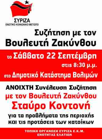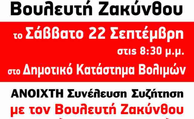 Ανοικτή συνέλευση- συζήτηση με τον βουλευτή Ζακύνθου Σταύρο Κοντονή, για τα προβλήματα της περιοχής και τις προτάσεις των φορέων και των κατοίκων, θα πραγματοποιηθεί το Σάββατο 22 Σεπτέμβρη στις 8.30 μμ στο Δημοτικό κατάστημα Βολιμών