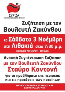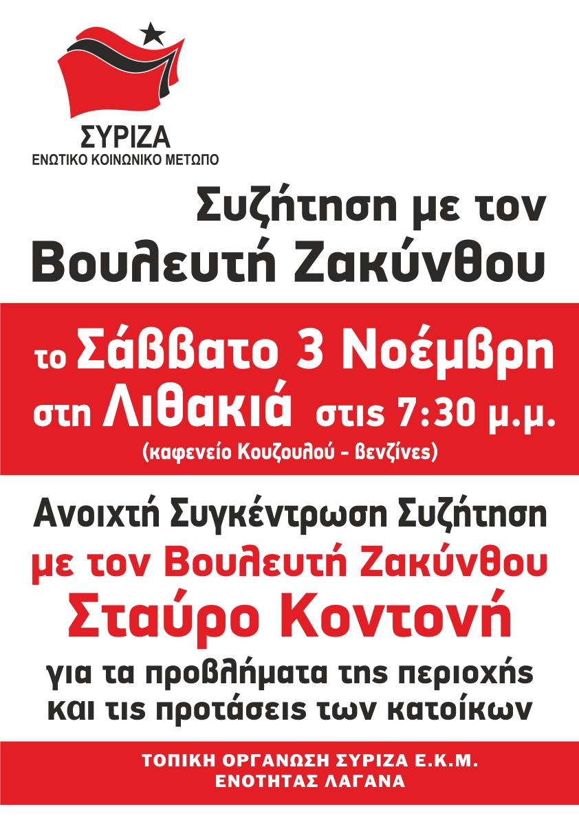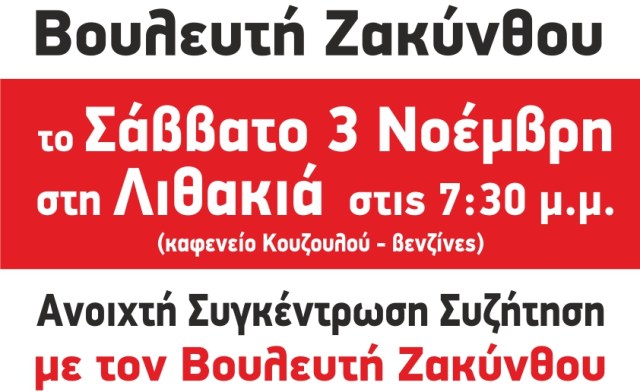 Συγκέντρωση – Συζήτηση με τον βουλευτή Ζακύνθου, το Σάββατο 3 Νοέμβρη στις 7.30 μμ, στη Λιθακιά