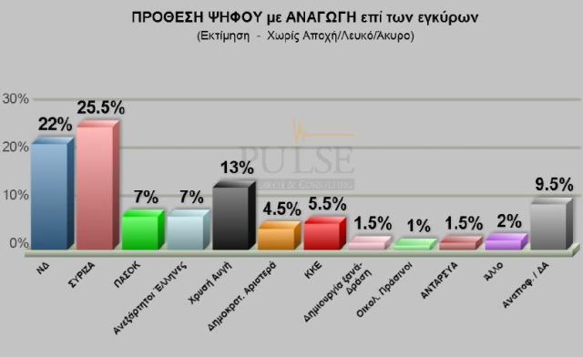 Προβάδισμα στον ΣΥΡΙΖΑ με 23% έναντι 20% της ΝΔ δίνει η νέα δημοσκόπηση της εταιρείας Pulse RC που δημοσιεύεται στην εφημερίδα «Το Ποντίκι».