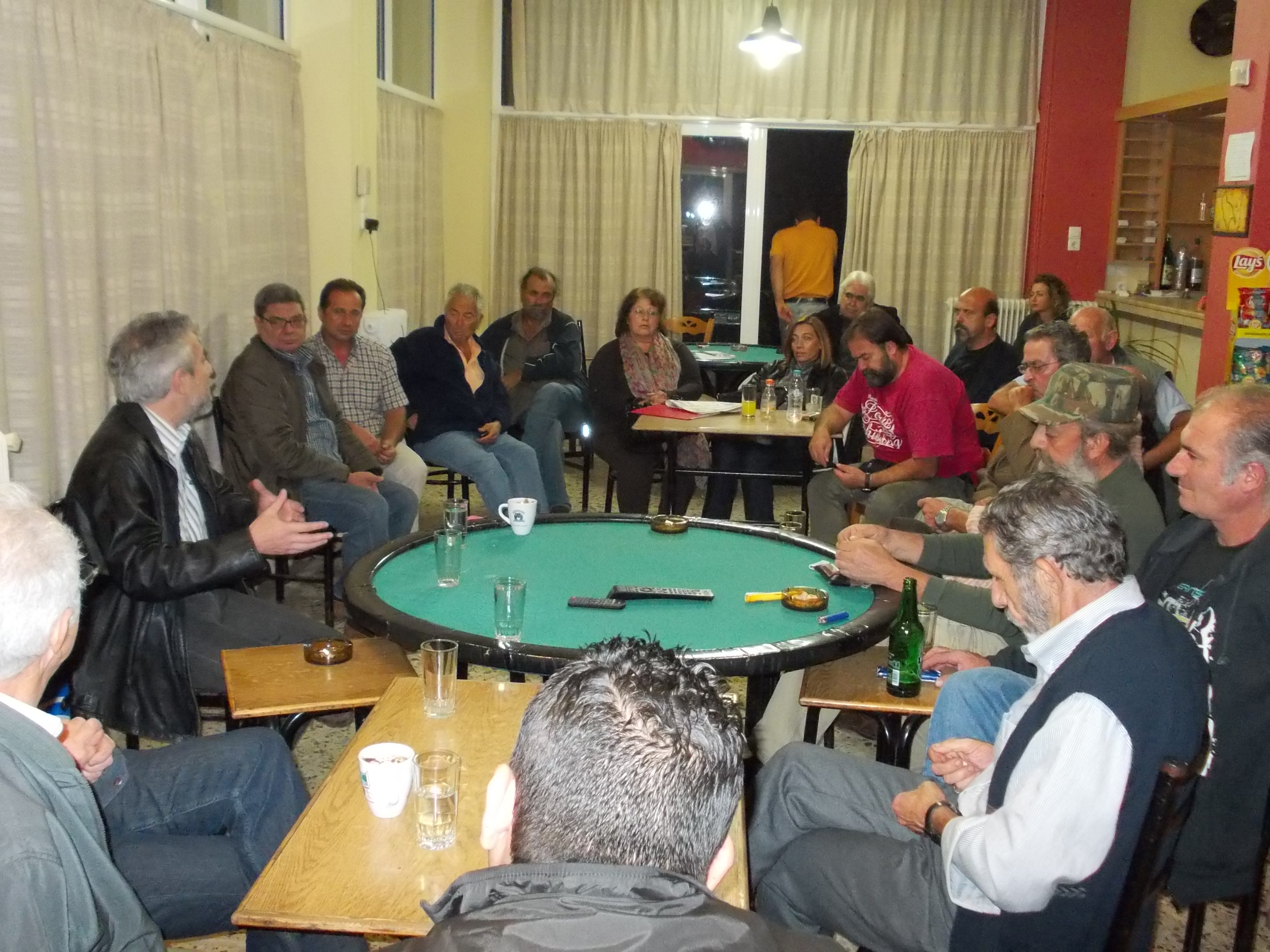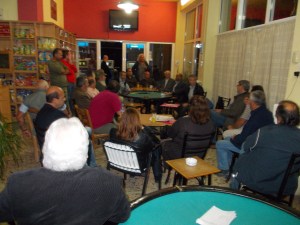 Ακολουθησε ζωηρός διάλογος με τους παρευρισκόμενους εν όψει της συζήτησης στη βουλή του νέου πακέτου μέτρων, για τον κλυδωνισμό της τρικοματικής συγκυβέρνησης, την κατάρρευση του Πασόκ και την πολιτική που θα εφαρμόσει η επερχόμενη κυβέρνηση της αριστεράς. Ιδιαίτερα τονίστηκε από το ακροατήριο η ανάγκη της αταλάντετης στάσης της κυβέρνησης του Συριζα στα ζητήματα της διαφθοράς και της ιδιοποίησης του δημόσιου χρήματος με την τιμωρία των ενόχων. Ιδιάτερο μέρος της κουβέντας αφιερώθηκε στα θέματα των αλλαγών σε ευρωπαικό επίπεδο και τις προτάσεις του Συριζα.