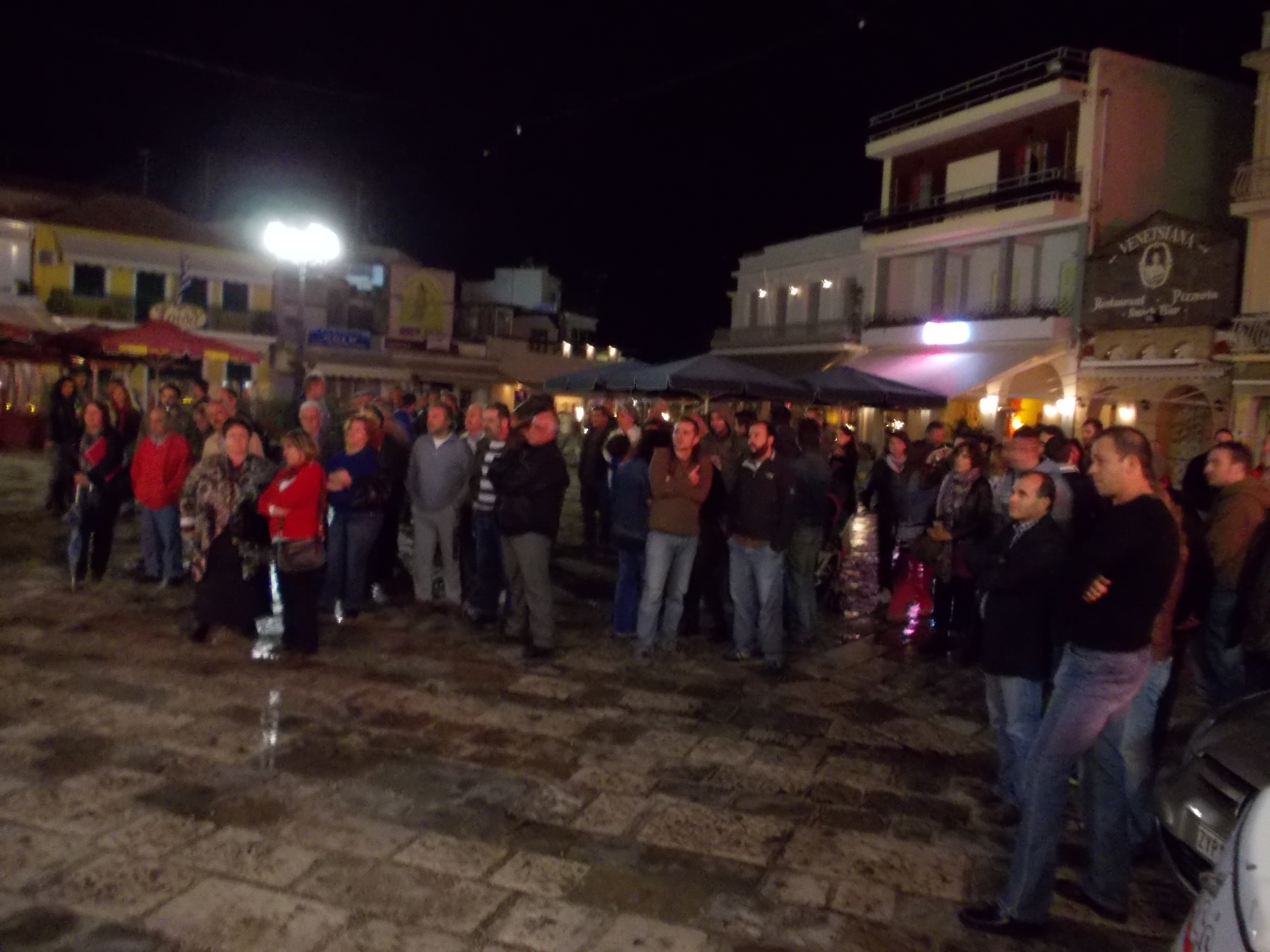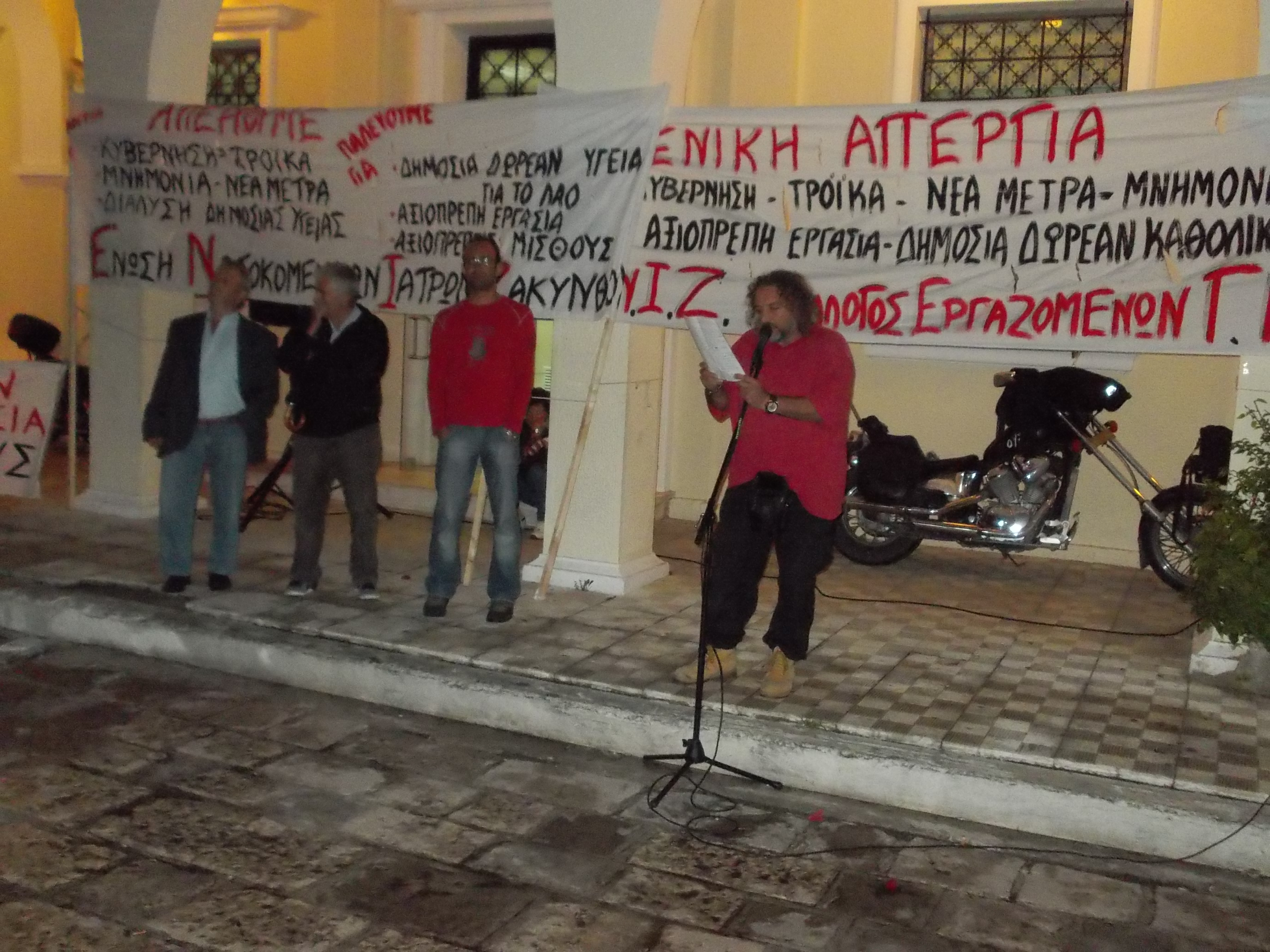 Παρά την κακοκαιρία και την συνεχή βροχή δεκάδες ζακυνθινοί συγκεντρώθηκαν την Τετάρτη 7 Νοέμβρη το απόγευμα στην πλατεία Αγ. Μάρκου, ανταποκρινόμενοι στο κάλεσμα του συντονιστικου αγώνα των σωματείων και μετα από χαιρετισμους των διοργανωτών πραγματοποίησαν πορεία στους δρόμους της πόλης.