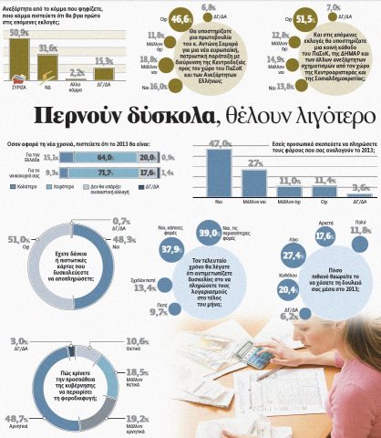 Περισσότερο απαισιόδοξοι εμφανίζονται οι πολίτες για το νέο έτος, εκτιμώντας πως το 2013 θα είναι χειρότερο από το 2012, σύμφωνα με τη δημοσκόπηση εν όψει του νέου έτους που διενεργήθηκε από την Κάπα Research για «Το Βήμα».
