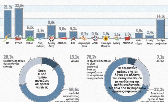 Σε ό,τι αφορά την πρόθεση ψήφου, προηγείται ο ΣΥΡΙΖΑ με 22,6% και ακολουθούν η ΝΔ με 21,5%, η Χρυσή Αυγή με 9,8%, το ΠΑΣΟΚ με 6,2%, το ΚΚΕ με 5,2%, η ΔΗΜΑΡ με 5% και οι Ανεξάρτητοι Έλληνες με 3,8%.