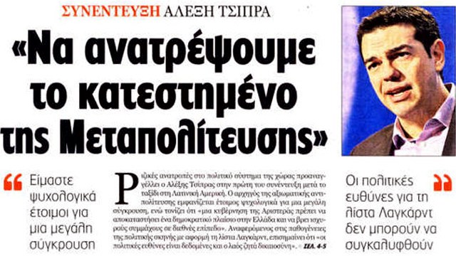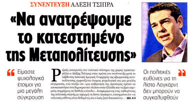 Η συνέντευξη του προέδρου της ΚΟ του ΣΥΡΙΖΑ-ΕΚΜ, Αλέξη Τσίπρα στην «Εφημερίδα των Συντακτών».