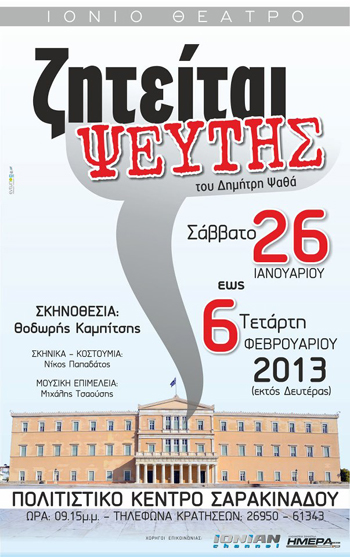 τη θεατρική παράσταση “Ζητείται ψεύτης”, του Δημήτρη Ψαθά,