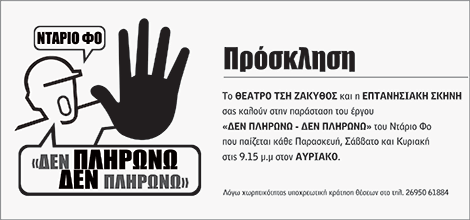 Το Θέατρο τση Ζάκυθος ξεκινάει, από την Κυριακή 17 Φεβρουαρίου, στον Αυριακό, παραστάσεις με τη γνωστή κωμωδία του Ιταλού συγγραφέα Ντάριο Φο «Δεν πληρώνω, δεν πληρώνω».