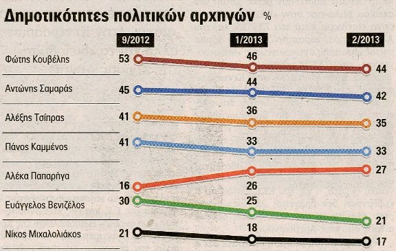Στις δημοτικότητες των πολιτικών αρχηγών προηγείται ο Φ. Κουβέλης με 44%, ακολουθεί ο Αντώνης Σαμαράς με 42% και τρίτος είναι ο Α. Τσίπρας με 35%