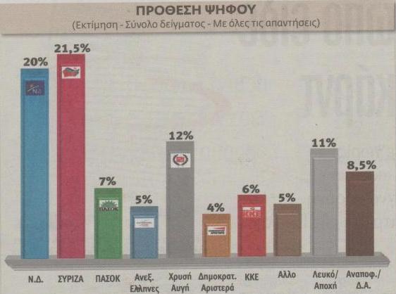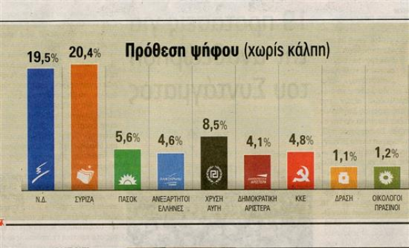Η ΝΔ συγκεντρώνει 19,5%, ο ΣΥΡΙΖΑ 20,45, το ΠΑΣΟΚ 5,6%, οι Ανεξάρτητοι Έλληνες 4,6%, η Χρυση Αυγή 8,5%, η ΔΗΜΑΡ 4,1%, το ΚΚΕ 4,8%, και άλλο κόμμα δηλώνει ότι ψηφίζει το 4,2%. Η αδιευκρίνηστη ψήφος προσεγγίζει το 36,1%.