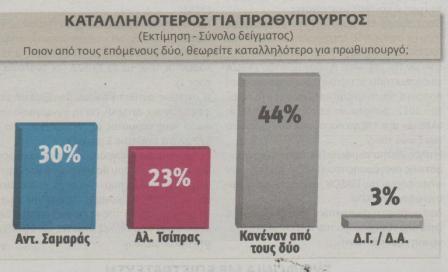 Στην ερώτηση για το ποιον θεωρείτε καταλληλότερο για πρωθυπουργό οι ερωτηθέντες απαντούν σε ποσοστό 30% τον Αντώνη Σαμαρά, σε ποσοστό 23% τον Αλέξη Τσίπρα, ενώ το 44% απαντά κανένας από τους δύο