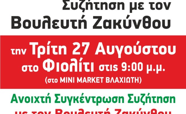 Τρίτη 27 Αυγούστου στις 9.00 μμ στο Φιολίτι, μίνι-μάρκετ Βλαχιώτη, Συνάντηση-Συζήτηση με τον βουλευτή Ζακύνθου Στ. Κοντονή