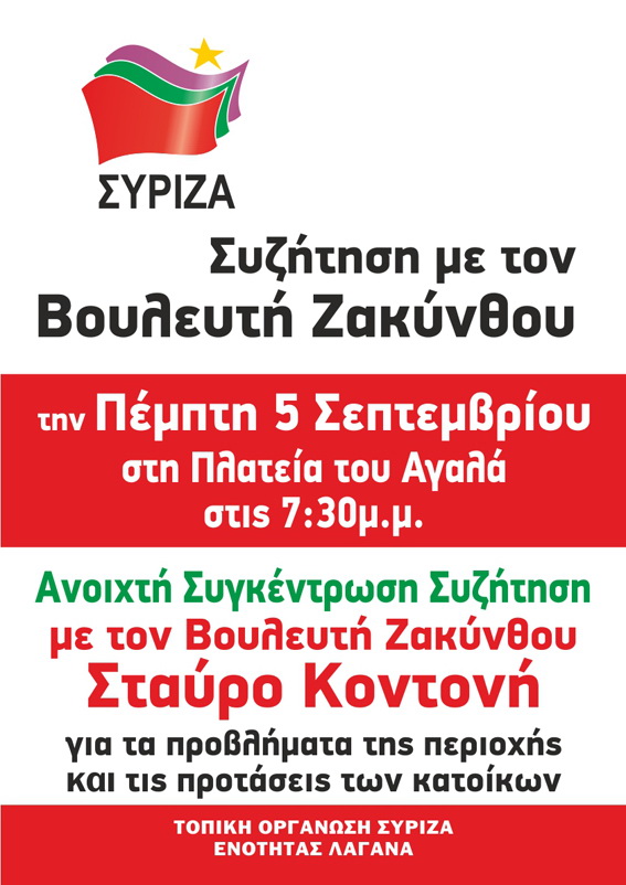 Πέμπτη 5 Σεπτέμβρη στις 7.30 στην πλατεία του Αγαλα , Συγκέντρωση – Συζητηση με το βουλευτή Ζακύνθου Στ. Κοντονη