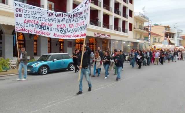 Αρχικά πραγματοποίθηκε συγκέντρωση εξω απο το κτίριο της Αντιπεριφέρειας όπου μίλησαν η αντιπρόεδρος του συλλόγου εργαζομένων Τίνα Κάνδυλα και ο πρόεδρος του εργατικού κέντρου Τάκης Στρούζας.Στη συνέχεια ακολούθησε πορεία στους κεντρικούς δρόμους της πόλης με συνθήματα: » Οι υγιειονομικοί δεν είναι συντεχνία παλευουν για δημόσια και δωρεάν υγεία» » Δημόσια παιδεία – δημόσια υγεία ελάτε να παλέψουμε για μιά άλλη κοινωνία» , «Εμπρός λαέ μην τους φοβηθείς ήρθε η ώρα της ανατροπής», «Το μέλλον ανήκει στον κόσμο της δουλειάς αυτός που πλεονάζει είναι ο Σαμαράς», » Εμπρός λαέ για την ανατροπή να διώξουμε κυβέρνηση-ΕΕ- ΔΝΤ», » Κανένας δεν ζεί με 400 ευρώ- πάρτε τα μνημόνια και φύγετε απο δω»