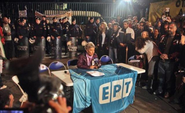 Με ελάχιστα τεχνικά μέσα αλλά περίσσια επιμονή, οι εργαζόμενοι της ΕΡΤ μπροστά σε μεγάλο πλήθος αλληλέγγυων παρουσίασαν μπροστα στην κατειλημμένη από τα ΜΑΤ ΕΡΤ το πρώτο στην ιστορία δελτίο ειδήσεων που γυρίστηκε στο δρόμο: