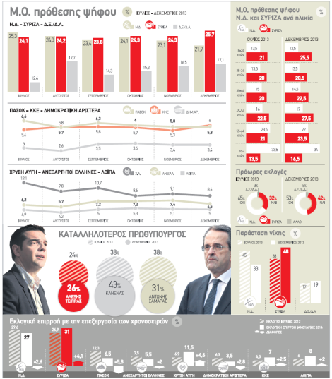 Με την βοήθεια της μελέτης των χρονοσειρών και της εναλλακτικής τοποθέτησης των αναποφάσιστων, παρατηρούμε την εκλογική επιρροή των κομμάτων στο τέλος της χρονιάς. Μετά τις εκλογές του Ιουνίου του 2012, ο ΣΥΡΙΖΑ, το ΚΚΕ, η Χρυσή Αυγή και τα Λοιπά Κόμματα, παρουσιάζουν σταθερή αύξηση, σε σχέση με τα εκλογικά αποτελέσματα. Αντίθετα η Ν.Δ., το ΠΑΣΟΚ, η ΔΗΜ.ΑΡ. και οι ΑΝ.ΕΛΛ. παρουσιάζουν μείωση των ποσοστών τους. Αυτή η γενική εικόνα διατηρείται επί 1,5 χρόνο και δύσκολα ανατρέπεται.