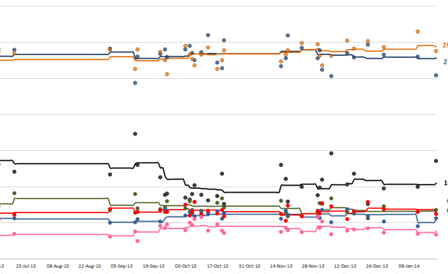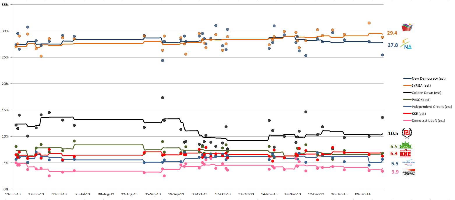 Η εκτίμηση εκλογικής επιρροής με βάση το μέσο όρο των δημοσκοπήσεων του Ιανουαρίου 2014, όπως υπολογίστηκε από το metapolls.net: