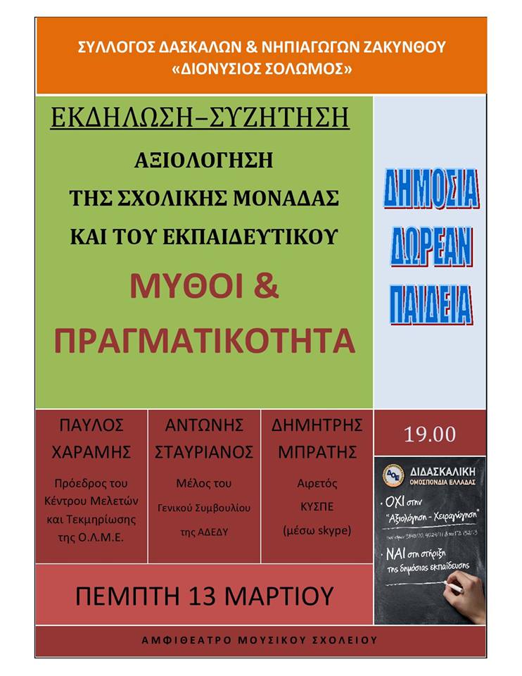 Πέμπτη 13 Μαρτίου Εκδήλωση- Συζήτηση για την Αξιολόγηση της Σχολικής Μονάδας