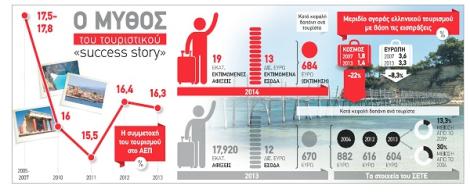 Και φυσικά το σενάριο επιτυχίας καταρρέει αν μελετήσει κανείς και τη διαχρονική κατανομή του μεριδίου αγορά που έχει ο ελληνικός τουρισμός από το 2007 μέχρι σήμερα με βάση τις τουριστικές εισπράξεις. Σύμφωνα με τα στοιχεία, ο ελληνικός τουρισμός κατείχε το 2007, με βάση τις εισπράξεις, το 3,6% της ευρωπαϊκής τουριστικής αγοράς και το 1,8% της παγκόσμιας. Το 2013 τα αντίστοιχα ποσοστά υποχώρησαν στο 3,3% για την Ευρώπη και στο 1,4% για την παγκόσμια αγορά (πτώση 8,3% και 22,% αντίστοιχα).