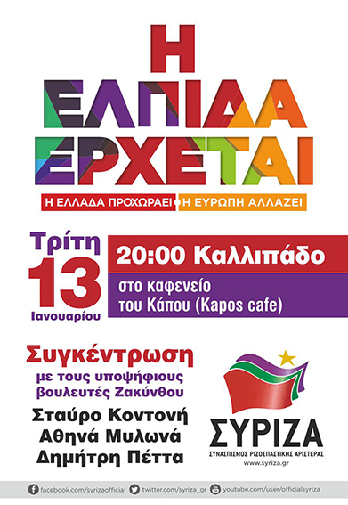 Τρίτη 13 Γενάρη ομιλίες των υποψηφίων βουλευτών Ζακύνθου του ΣΥΡΙΖΑ Κυψέλη 18.00 μμ στην Βιβλιοθήκη- Πλατεία Αγ Παρασκευής- Καλλιπάδο 20.00 μμ στο kapos Kafe