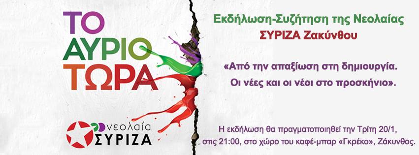 «Από την απαξίωση στη δημιουργία. Οι νέες και οι νέοι στο προσκήνιο» Εκδήλωση-Συζήτηση της Νεολαίας ΣΥΡΙΖΑ Ζακύνθου με τους υποψήφιους βουλευτές, Κοντονή Σταύρο δικηγόρο βουλευτή Ζακύνθου, Μυλωνα Αθηνά Λογίστρια και Πέττα Δημήτρη οικονομολόγο. Τρίτη 20/1, στις 21:00, στο χώρο του καφέ-μπαρ «Γκρέκο»