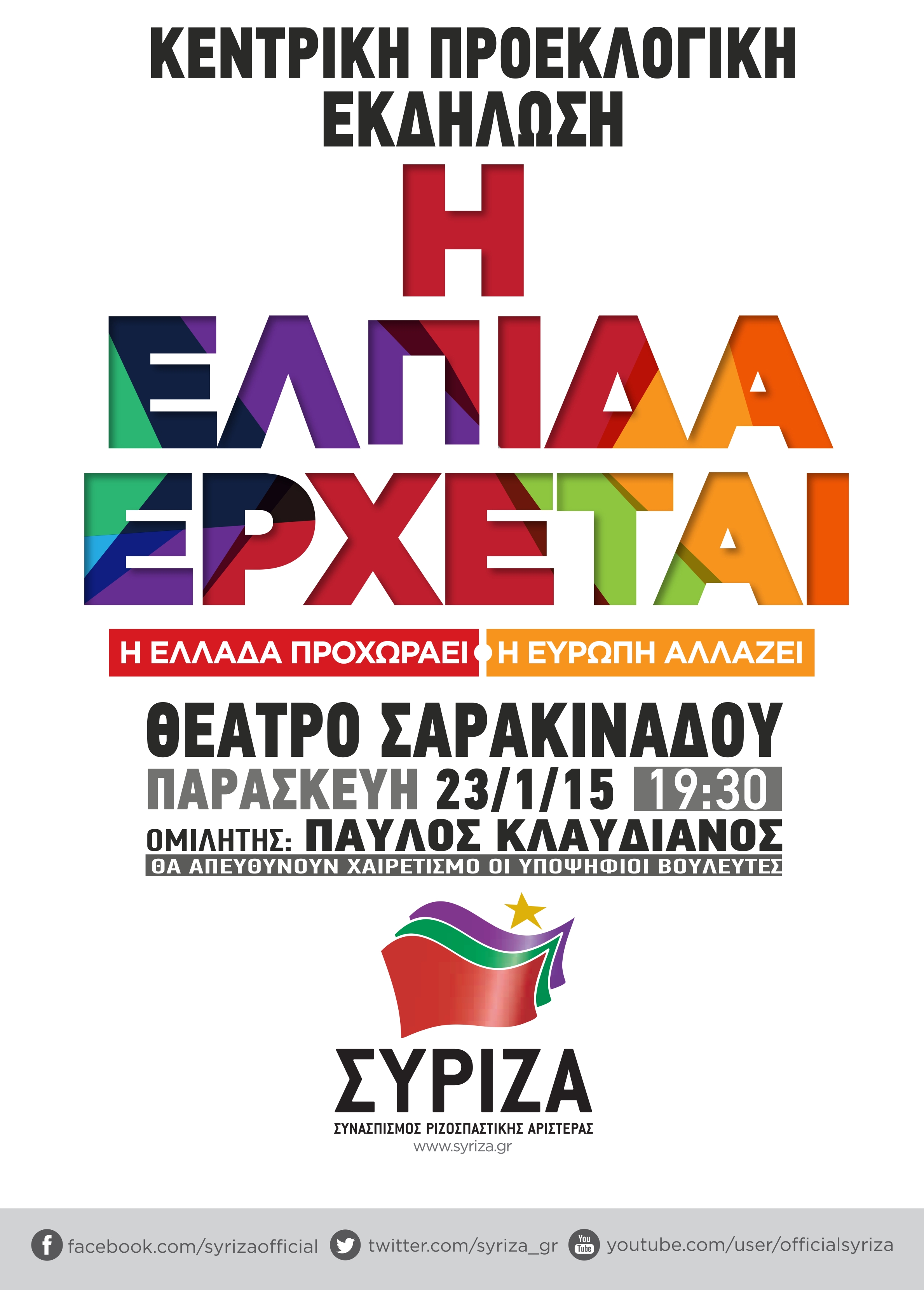 Παρασκευή 23 Γενάρη, Θέατρο Σαρακηνάδου 7.30 μμ, Κεντρική Προεκλογική Συγκέντρωση του ΣΥΡΙΖΑ στη Ζάκυνθο. Ομιλητής Παύλος Κλαυδιανός, θα χαιρετίσουν οι υποψήφιοι βουλευτές