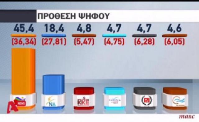 Συγκεκριμένα, στην πρόθεση ψήφου ο ΣΥΡΙΖΑ συγκεντρώνει το 45,4 %, έναντι 18,4% της Νέας Δημοκρατίας. Στην Τρίτη θέση το ΚΚΕ με 4,8% και ακολουθούν οι Ανεξάρτητοι Έλληνες και η Χρυσή Αυγή με 4,7% και το Ποτάμι με 4,6%.