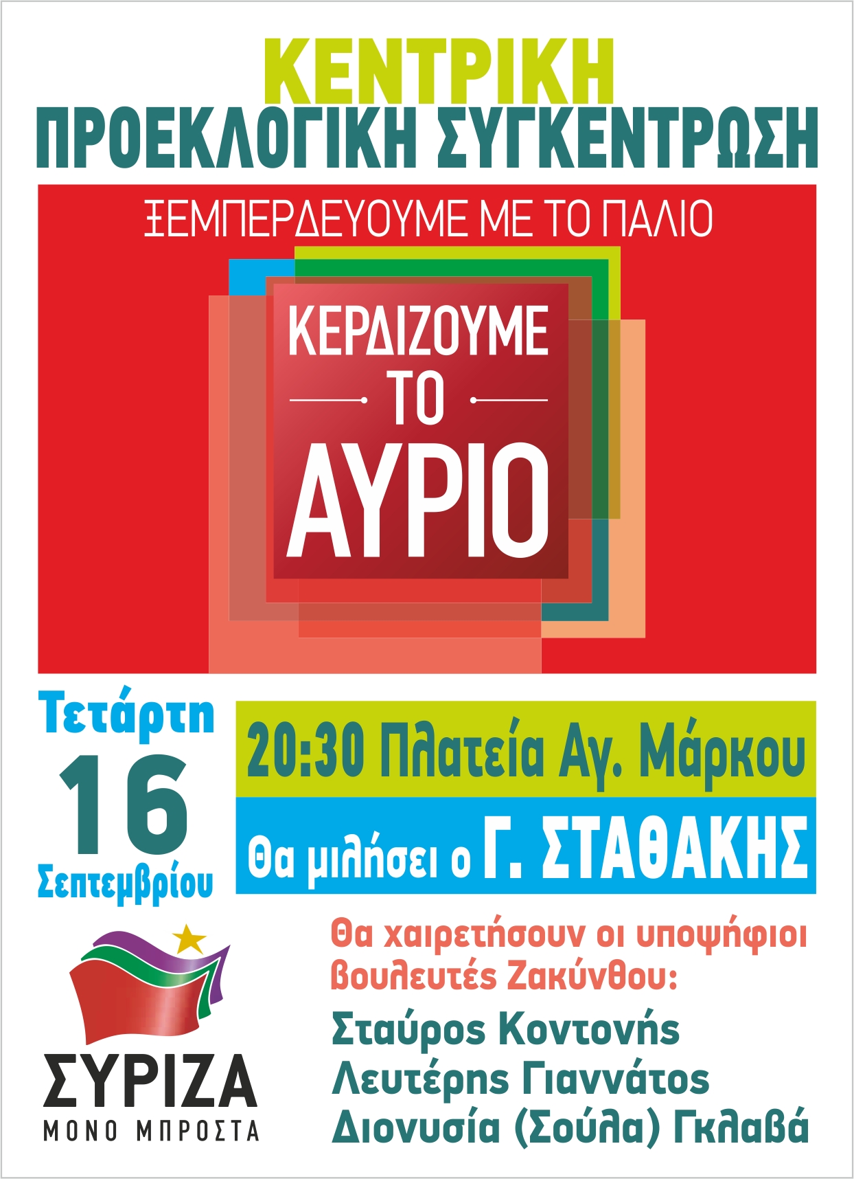 Ο Γιωργος Σταθακης στην κεντρική προεκλογική συγκέντρωση του ΣΥΡΙΖΑ, την Τετάρτη 16/9, 8.30 μμ στην Πλατεία Αγ. Μάρκου