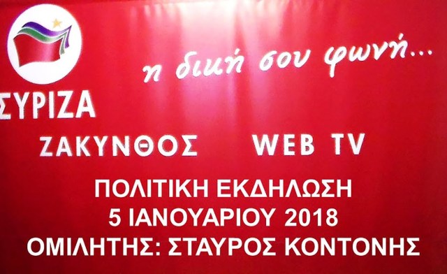 Πολιτική εκδήλωση του ΣΥΡΙΖΑ Ζακύνθου διοργανώνεται στις 5 Γενάρη στις 8 το βράδυ στο ξενοδοχείο Παλατίνο, με ομιλητή τον υπουργό δικαιοσύνης Σταύρο Κοντινή