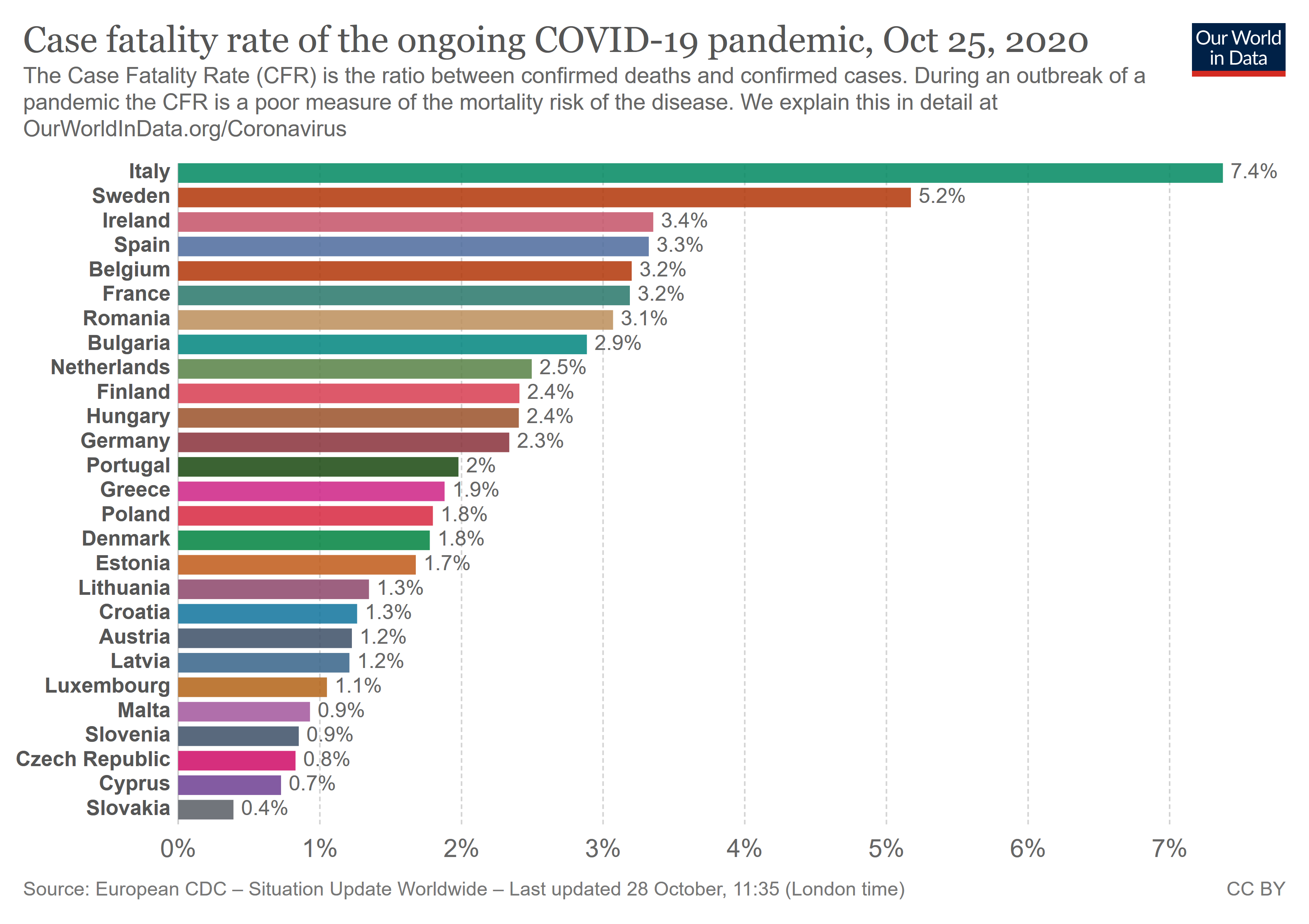 Προφανώς όλες οι χώρες μετριούνται στον αντίστοιχο δείκτη, ο οποίος αποτυπώνει το ποσοστό των θανόντων επί των επιβεβαιωμένων κρουσμάτων. Εδώ με τα δεδομένα της 25ης Οκτωβρίου η Ελλάδα είναι 14η στις 27 χώρες της Ε.Ε, στη μέση δηλαδή και δυστυχώς όχι στις καλύτερες.