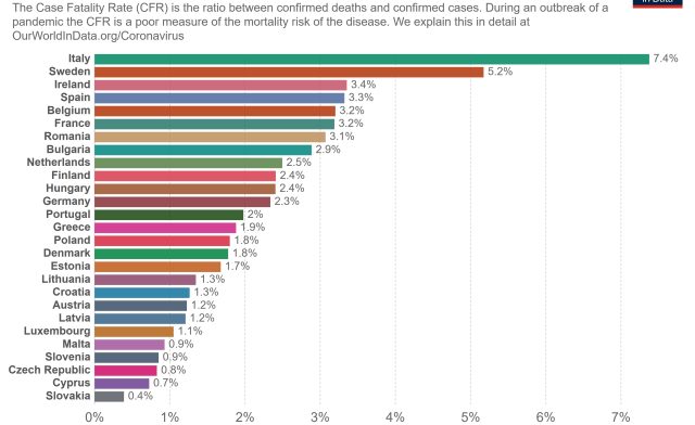 Προφανώς όλες οι χώρες μετριούνται στον αντίστοιχο δείκτη, ο οποίος αποτυπώνει το ποσοστό των θανόντων επί των επιβεβαιωμένων κρουσμάτων. Εδώ με τα δεδομένα της 25ης Οκτωβρίου η Ελλάδα είναι 14η στις 27 χώρες της Ε.Ε, στη μέση δηλαδή και δυστυχώς όχι στις καλύτερες.