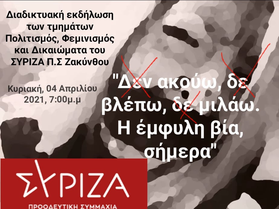 Την Κυριακή 4 Απριλίου στις 7μμ , τα τμήματα Φεμινιστική Πολιτική, Πολιτισμός και Δικαιώματα της Νομαρχιακής Επιτροπής του ΣΥΡΙΖΑ – Π.Σ Ζακύνθου διοργανώνουμε διαδικτυακή εκδήλωση συζήτηση με θέμα ¨(Δεν) ακούω, (δε) βλέπω, (δε) μιλάω. Η έμφυλη βία, σήμερα¨