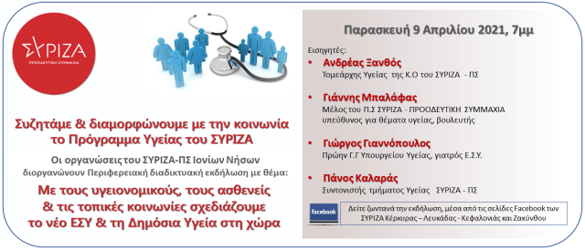 Οι Νομαρχιακές Επιτροπές του ΣΥΡΙΖΑ-ΠΡΟΟΔΕΥΤΙΚΗ ΣΥΜΜΑΧΙΑ Ιονίων Νήσων διοργανώνουν ζωντανή διαδικτυακή εκδήλωση, την Παρασκευή 9 Απριλίου στις 19:00, με θέμα:«Με τους υγειονομικούς, τους ασθενείς & τις τοπικές κοινωνίες σχεδιάζουμε το νέο Ε.Σ.Υ & τη Δημόσια Υγεία στη χώρα μας.»