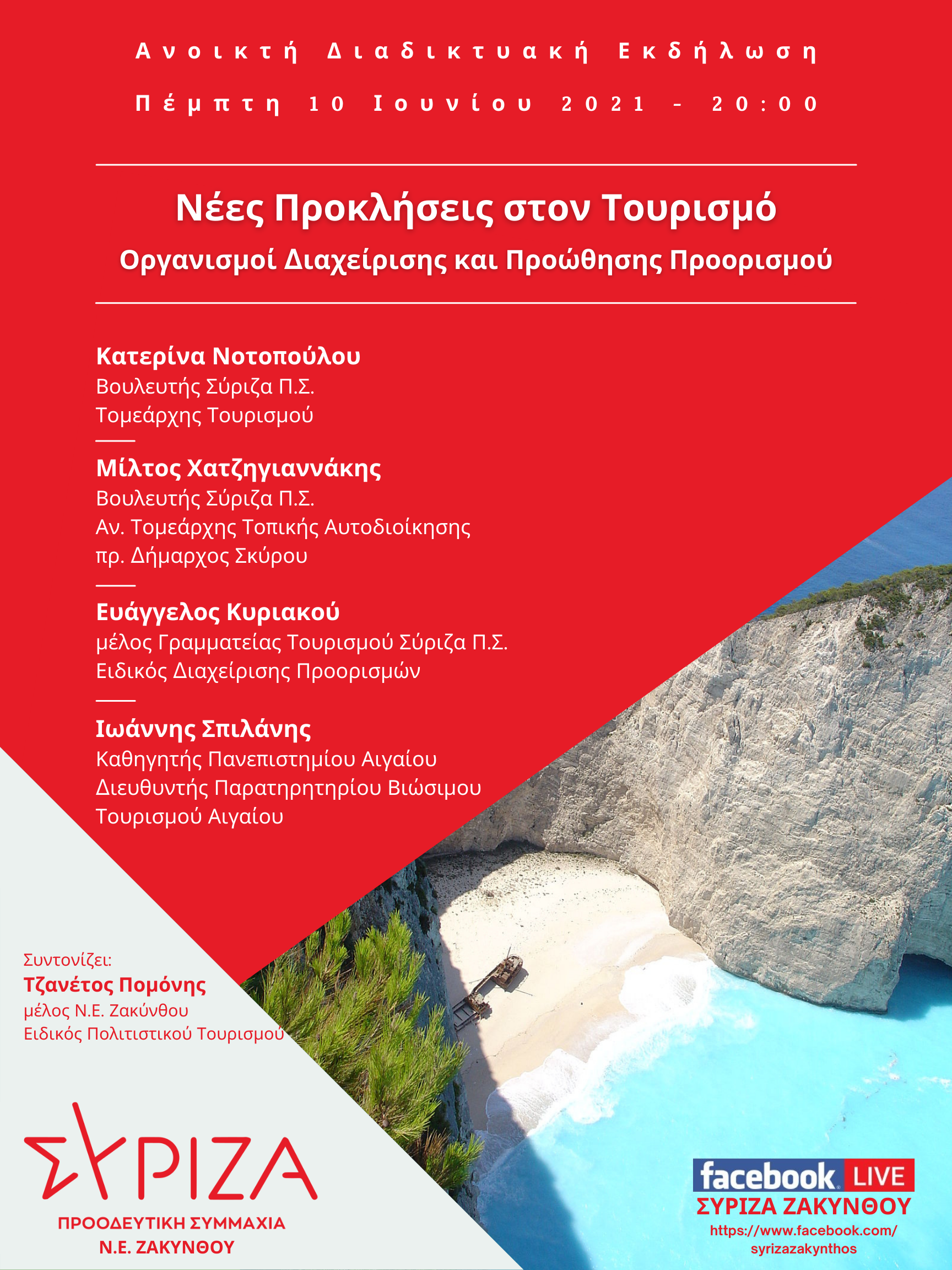 Νέες προκλήσεις στον Τουρισμό – Οργανισμοί Διαχείρισης και Προώθησης Προορισμού // Η Ν Ε Ζακύνθου του ΣΥΡΙΖΑ – Προοδευτική Συμμαχία, διοργανώνει διαδικτυακή εκδήλωση την Πέμπτη 10/06/2021, 8:00 μ.μ.