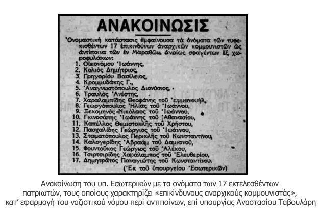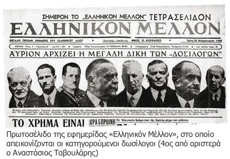 Ο Αναστάσιος Ταβουλάρης απεικονίζεται πρώτος από αριστερά , δίπλα στον πρωθυπουργό Ιωάννη Ράλλη και στον αρχηγό των ταγμάτων ασφαλείας Αθηνών υποστράτηγο Βασίλειο Ντερτιλή.