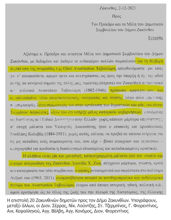 «[…] απευθυνόμαστε προς εσάς για ν’ αποφασίσετε, αμερόληπτα και ανεπηρέαστα ως προς την ύπαρξη ή όχι της οδού αυτής, σε κεντρικό σημείο της πόλης μας, τιμώντας (άπρεπα) τον Ζακυνθινό στρατιωτικό και πολιτικό Αναστάσιο Ταβουλάρη, πρόσωπο αμφιλεγόμενο και καταδικασμένο λόγω […] φιλογερμανικής συμπεριφοράς, συμμετοχής του στην οργάνωση των […] αδελφοκτόνων Ταγμάτων Ασφαλείας, λόγω του ότι υπήρξε μέλος κατοχικών κυβερνήσεων, κρινόμενος ως δωσίλογος από Ειδικό Δικαστήριο στην Ελλάδα , χωρίς κάποιον μάρτυρα υπεράσπισης […], το οποίο τον καταδίκασε “Διά την πράξιν της διευκολύνσεως του έργου της Κατοχής εις ισόβια δεσμά”. […] ήταν μέλος των φιλοναζιστικών κυβερνήσεων του Κων. Λογοθετόπουλου και του Ιωάννη Ράλλη. Το 1944, ακολούθησε τους Γερμανούς στην Αυστρία, συνεχίζοντας τη δράση του ώς τη σύλληψή του από τους Αμερικανούς […]. Επιβάλλεται η μετονομασία της οδού Ταβουλάρη, που αποτελεί προσβολή για την ιστορική Ζάκυνθο […], καθώς τιμάται ένας αποδεδειγμένα δωσίλογος και μάλιστα με μια οδό ευρισκόμενη ανάμεσα στις οδούς των επιφανών Αλεξάνδρου Ρώμα και Ανδρέα Κάλβου!».