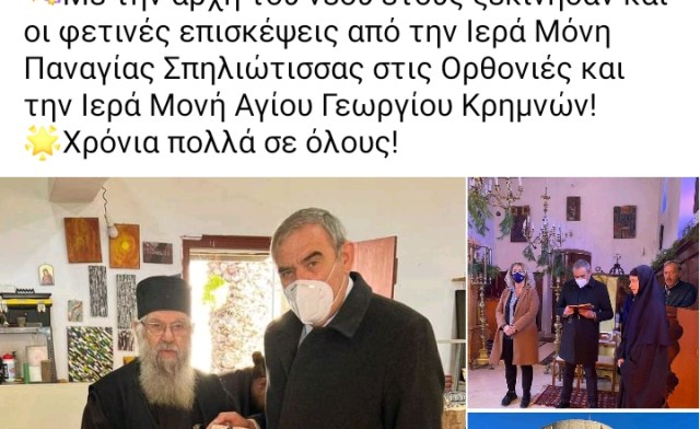 Η ανακοίνωση της ΝΕ συνοδεύεται από φωτογραφίες που έχει αναρτήσει ο Βουλευτής στον προσωπικό του λογαριασμό στο Facebook από την Ι.Μ. Παναγίας Σπηλιώτισσας στις Ορθονιές και από την Ι.Μ. Αγίου Γεωργίου Κρημνών.