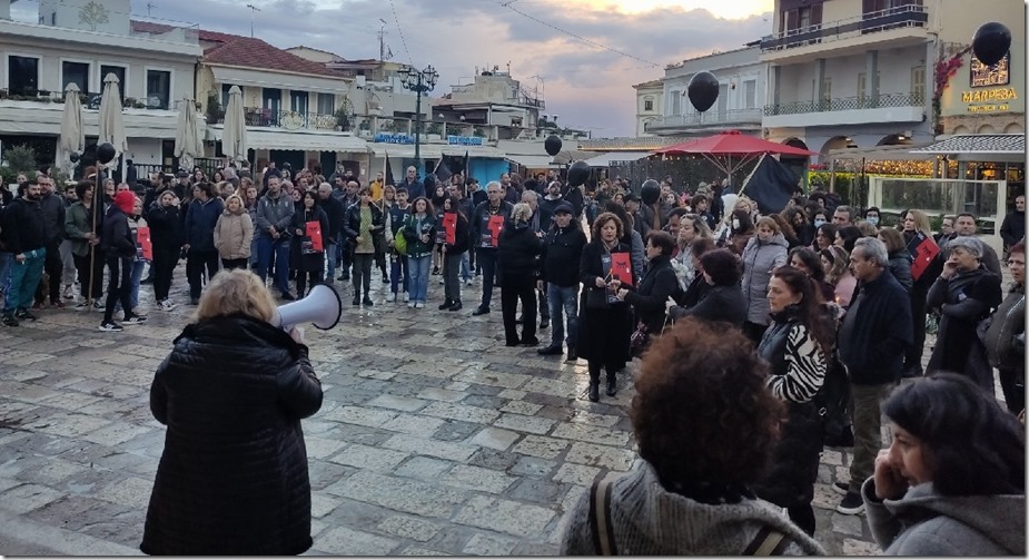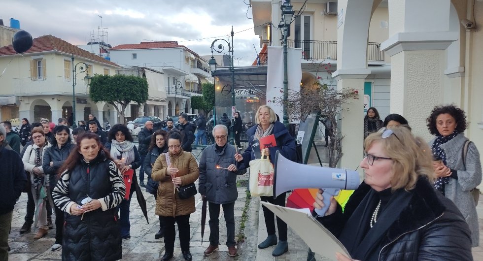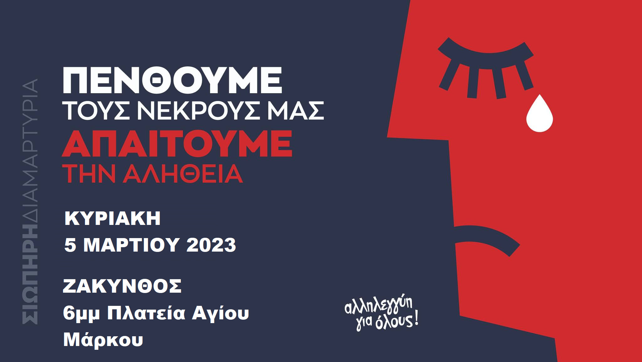 Σιωπηρή διαμαρτυρία για την τραγωδία στα Τέμπη πραγματοποιήθηκε την Κυριακή (5/3) από την «Αλληλεγγύη για όλους» στην πλατεία Αγίου Μάρκου, στη Ζάκυνθο. «Βιώνουμε μια ανείπωτη τραγωδία, πενθούμε τον άδικο χαμό δεκάδων κυρίως νέων ανθρώπων, ζητάμε να μάθουμε την αλήθεια», σημειώνουν τα μέλη της ομάδας.