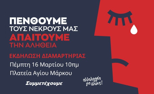 «Η ΑΛΛΗΛΕΓΓΥΗ ΓΙΑ ΟΛΟΥΣ ΣΥΜΜΕΤΕΧΕΙ ΣΤΗΝ ΠΑΝΕΛΛΑΔΙΚΗ ΚΙΝΗΤΟΠΟΙΗΣΗ ΓΙΑ ΝΑ ΜΗΝ ΞΕΧΑΣΤΕΙ ΤΟ ΕΓΚΛΗΜΑ ΤΩΝ ΤΕΜΠΩΝ//ΑΥΡΙΟ ΠΕΜΠΤΗ 16/3 ΣΤΙΣ 10:00 ΠΜ ΣΤΗΝ ΠΛΑΤΕΙΑ ΤΟΥ ΑΓΙΟΥ ΜΑΡΚΟΥ»