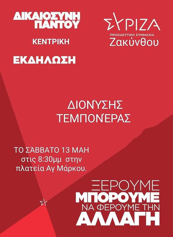 Ζάκυνθος, Σάββατο 13 Μάη – 20.30 – Πλατεία Αγίου Μάρκου.