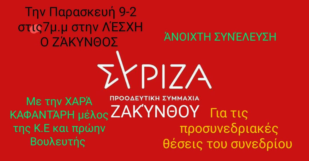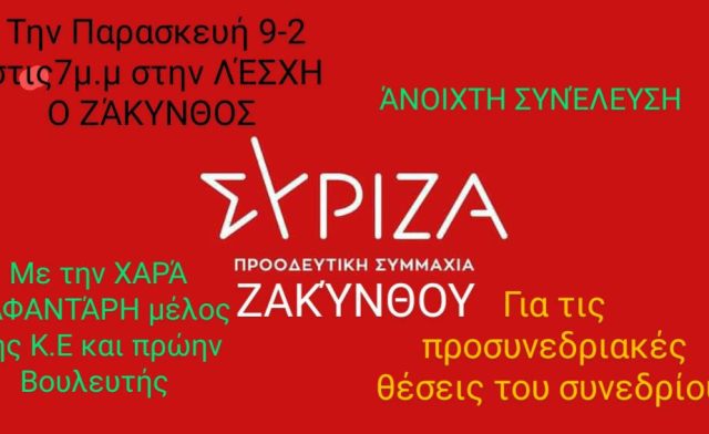 Κορυφώνεται ο προσυνεδριακός διάλογος του ΣΥΡΙΖΑ-ΠΣ // πολιτική εκδήλωση, Παρασκευή, 9 Φεβρουαρίου 19.00, «ΛΕΣΧΗ Ο ΖΑΚΥΝΘΟΣ»// ομιλήτρια: Χαρά Καφαντάρη