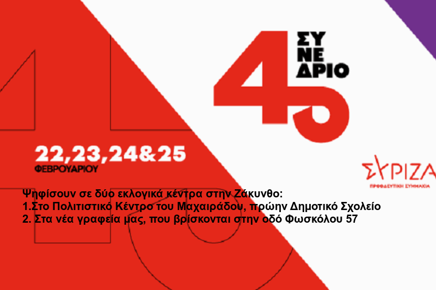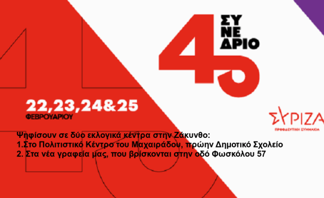 Την Κυριακή 18/02 από 10:00π.μ έως και 6:00μμ, θα διεξαχθούν οι εκλογές για ανάδειξη εκπροσώπων του ΣΥΡΙΖΑ ΠΣ Ζακύνθου, στο 4ο Συνέδριο του κόμματος.