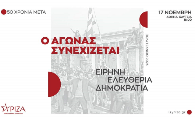 Το Πολυτεχνείο Ζει στους αγώνες για Ψωμί – Παιδεία- Ελευθερία – Ειρήνη // Η ΝΕ του ΣΥΡΙΖΑ -ΠΣ θα καταθέσει Στεφάνι στο Μνημείο Εθνικής Αντίστασης, Πλατεία Σολωμού, Κυριακή 17/11, 10:30 πμ.