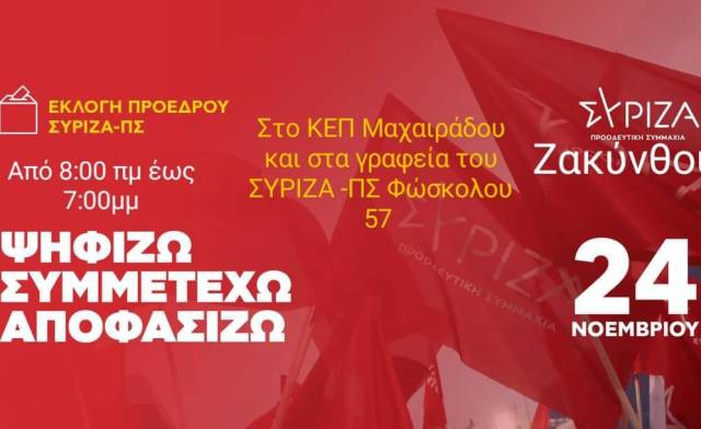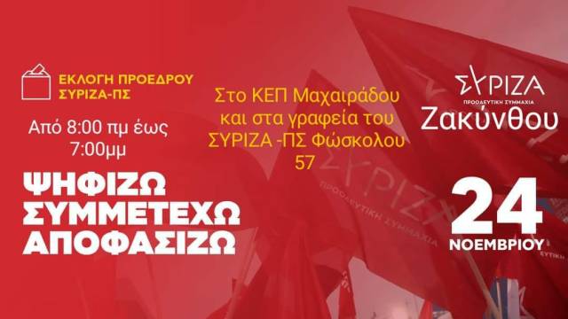 Κυριακή 24 Νοέμβρη από 8 πμ – 7 μμ // Εκλογικά Κέντρα 1) Γραφεία Συριζα-ΠΣ Φωσκόλου 57 – 2) ΚΕΠ Μαχααράδου ( έναντι Αγ. Μαυρας )