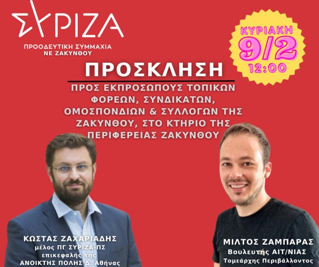 Η ΝΕ Ζακύνθου του Συριζα ΠΣ καλεί τους παραγωγικούς, κοινωνικούς, πολιτιστικούς και αθλητικούς φορείς και συλλόγους της Ζακύνθου // Σύσκεψη την Κυριακή 9/2 στις 12.00 στην αίθουσα εκδηλώσεων της Περιφέρειας
