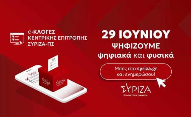 Εκλογές για την Κ.Ε του ΣΥΡΙΖΑ -ΠΣ // Κυριακή 29 Ιούνη από 10 πμ έως 7μμ // Ψηφίζουμε είτε ηλεκτρονικά είτε με προσέλευση στα εκλογικά τμήματα ( 1. Γραφεία Συριζα ΠΣ Φωσκόλου 57 – 2. ΚΕΠ Μαχαιράδου)