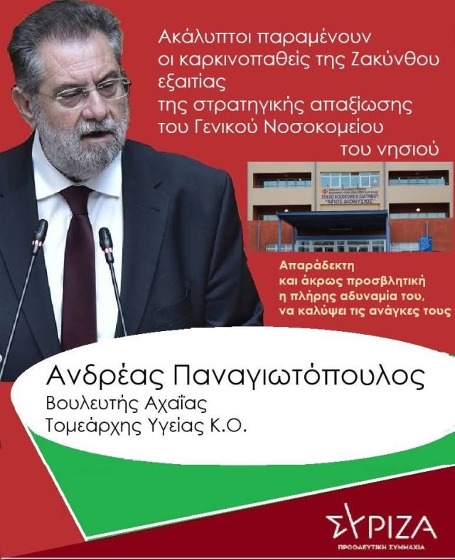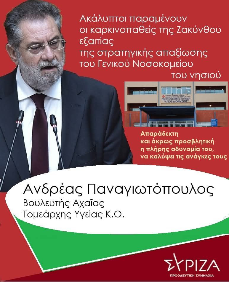 Ερώτηση προς τον Υπουργό Υγείας με θέμα «Απαράδεκτη και άκρως προσβλητική η πλήρης αδυναμία του Γ.Ν Ζακύνθου να καλύψει τις ανάγκες των καρκινοπαθών» κατέθεσε με τις συνυπογραφές δώδεκα (12) βουλευτών του ΣΥΡΙΖΑ-ΠΣ, ο Βουλευτής Αχαΐας και Τομεάρχης Υγείας του ΣΥΡΙΖΑ-ΠΣ Ανδρέας Παναγιωτόπουλος.