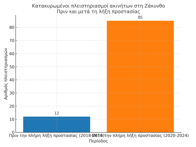 - Παράδειγμα Ζακύνθου: από ~5 ακίνητα προ του 2019 σε ~85 μετά (ενδεικτική τάξη μεγέθους).