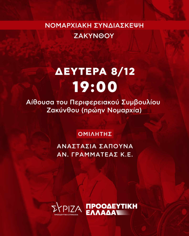Δευτέρα 8/12, 19:00, Αίθουσα Περιφερειακού Συμβουλίου Νομαρχιακή Συνδιάσκεψη // θα μιλήσει η Αναστασία Σαπουνά, Αναπ. Γραμματέας της Κεντρικής Επιτροπής του Συριζα ΠΣ