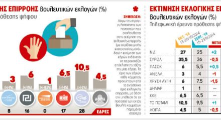 Στην παράσταση νίκης η ψαλίδα ανοίγει στις 44 μονάδες, ενώ αυξάνεται το ποσοστό των ψηφοφόρων που βλέπουν το κόμμα της αξιωματικής αντιπολίτευσης να κερδίζει τις εκλογές με μεγάλη διαφορά Διαβάστε σχετικά τις δηλώσεις του Γ. Μαυρή: Η διαφορά ΝΔ-ΣΥΡΙΖΑ δεν ανατρέπεται εύκολα και ακούστε σχετικό ηχητικό. http://www.efsyn.gr/wp-content/uploads/2014/10/mauris25-10-14.mp3 Στην παράσταση νίκης η ψαλίδα ανοίγει στις 44 … Συνέχεια