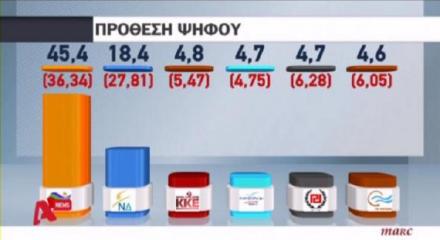Προβάδισμα 27% του ΣΥΡΙΖΑ έναντι της Νέας Δημοκρατίας, που καταγράφει ποσοστά της τάξης του 18,4%, δίνει δημοσκόπηση της Marc για τον ALPHA Συγκεκριμένα, στην πρόθεση ψήφου ο ΣΥΡΙΖΑ συγκεντρώνει το 45,4 %, έναντι 18,4% της Νέας Δημοκρατίας. Στην Τρίτη θέση το ΚΚΕ με 4,8% και ακολουθούν οι Ανεξάρτητοι Έλληνες και η Χρυσή Αυγή με 4,7% … Συνέχεια