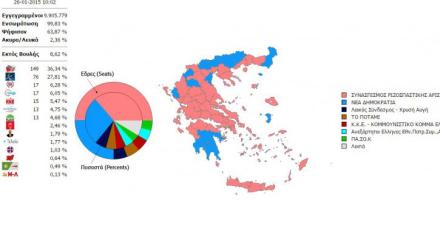 Στο 99,83% το κόμμα της ριζοσπαστικής αριστεράς συγκέντρωσε 36,34% με 2.245.000 ψηφοφόρους να επιλέγουν ελπίδα – Εκλέγει 149 βουλευτές ο ΣΥΡΙΖΑ – Στο 27,81% η ΝΔ με 76 βουλευτές, ακολουθούν Χρυσή Αυγή και Ποτάμι με 17 βουλευτές, ΚΚΕ με 15, ΑΝΕΛ και ΠΑΣΟΚ με 13. Κορυφαία στελέχη και πρώην υπουργοί μένουν εκτός της νέας Βουλής … Συνέχεια